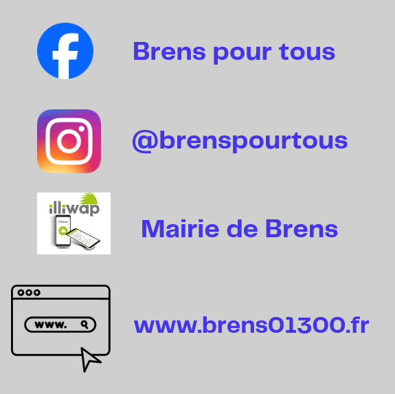 Ne manquez rien de la vie de notre commune : projets, animations, services municipaux, conseils et événements… Tout est accessible en quelques clics ! 👉 Retrouvez-nous sur : Facebook : Brens pour tous Instagram : @brenspourtous Illiwap : Mairie de Brens Site web : www.brens01300.fr