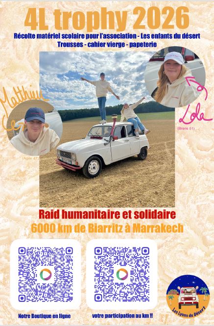 👉 Objectif : acheminer des fournitures scolaires collectées pour les enfants, en partenariat avec l’association Les Enfants du Désert.