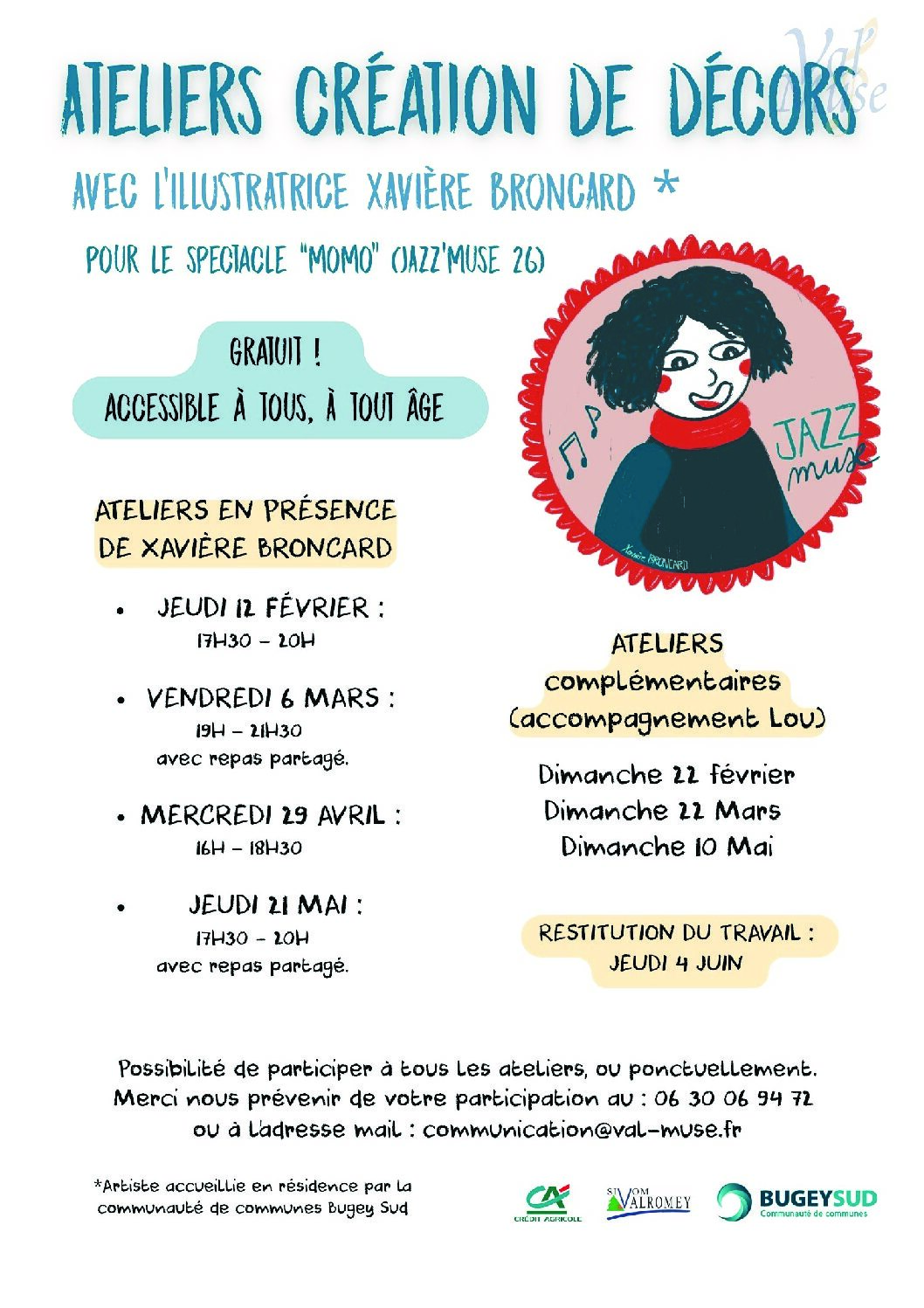 Ateliers de création de décors – Spectacle “Momo” : en partenariat avec l’association Val’Muse, ces ateliers participatifs permettront de réaliser les décors du spectacle musical Momo, présenté dans le cadre du festival Jazz’Muse.